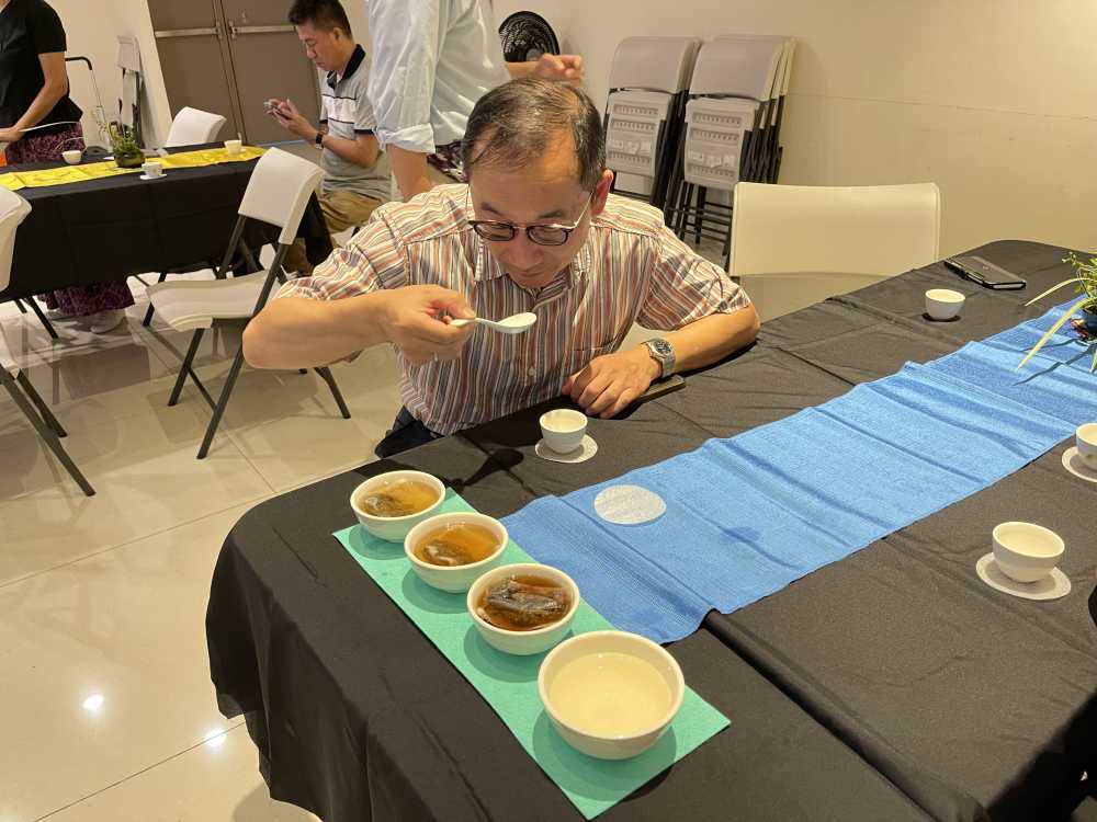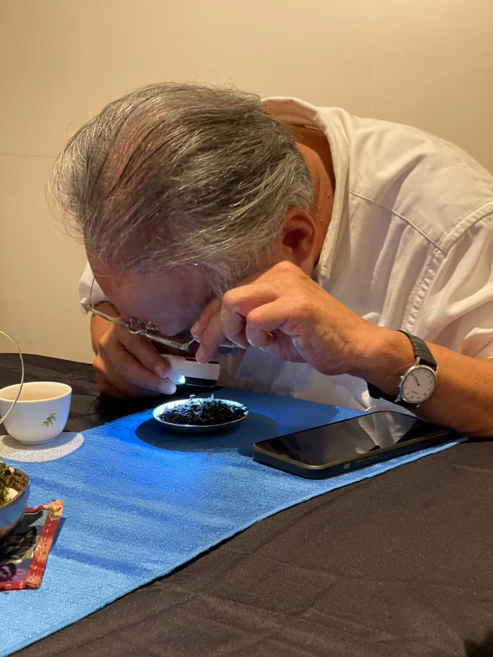▲▲汐止第一任街長陳定國後代陳澄聲也參與活動,現場品茗。▲汐止社大講師高松根教授用40倍放大鏡檢視超過四十年的建順茶行老茶葉。(照片 / 蘇凡媛)
